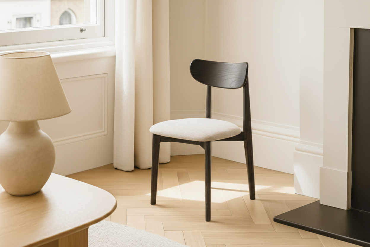 A design classic, this stunning Scandinavian black solid oak dining chair combines timeless elegance with modern comfort. Made from solid oak with a luxurious upholstered linen seat pad, this chair offers the perfect balance of style and practicality. The oatmeal-colored linen cushioning provides exceptional comfort for extended dining, while the added spill resistance makes it ideal for everyday family use. A perfect addition to your dining space or an occasional chair around your home, this design works well with our more minimalist style furniture and complements our core table range perfectly.