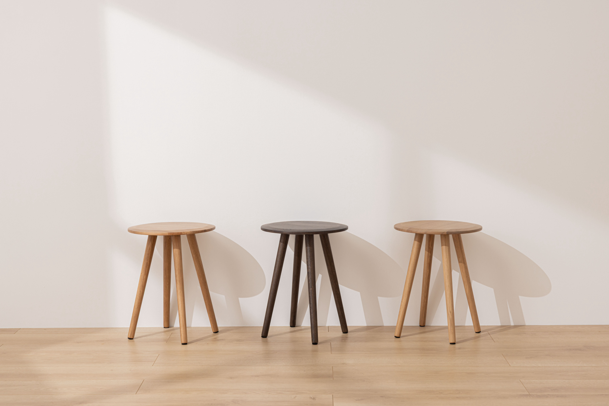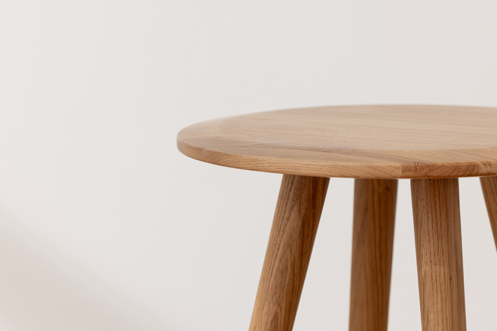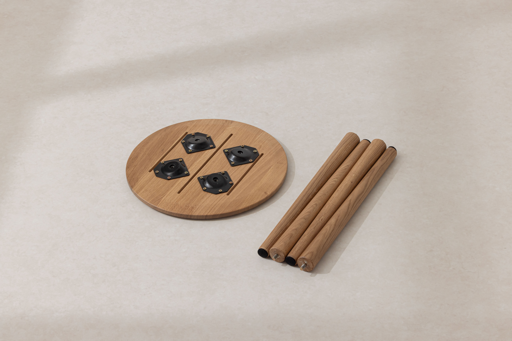 The stool is constructed from 100% solid oak, showcasing the natural warmth and grain of the wood. Each leg is precision-turned and secures easily into pre-mounted metal fixings on the underside of the seat. No tools required for setup—just twist and seat.